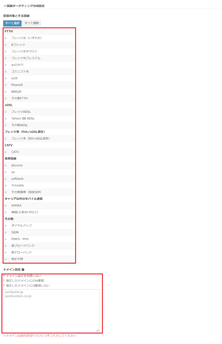 • ドメイン設定: 広告配信対象とするオーディエンスの利用回線で、さらにドメインによる絞り込みができます。