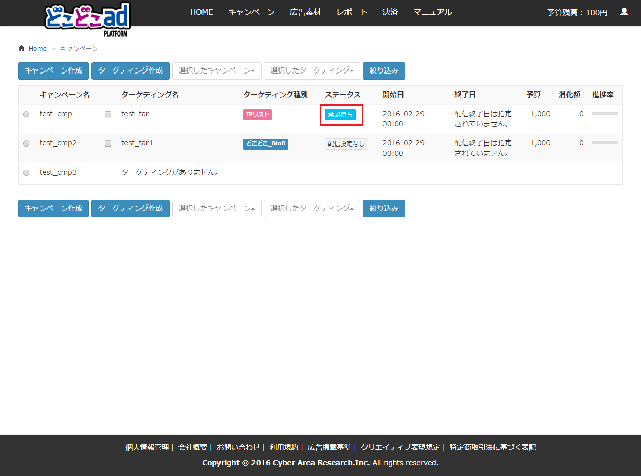 2. キャンペーン一覧画面に移動します。通知メール設定をしようとしているターゲティングの「ステータス」をクリックします。
