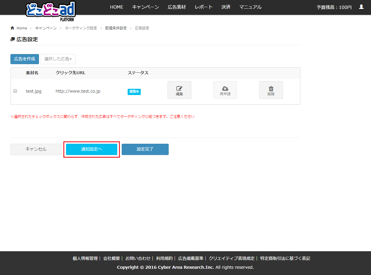 3. 広告設定画面に移動します。「通知設定へ」をクリックします。