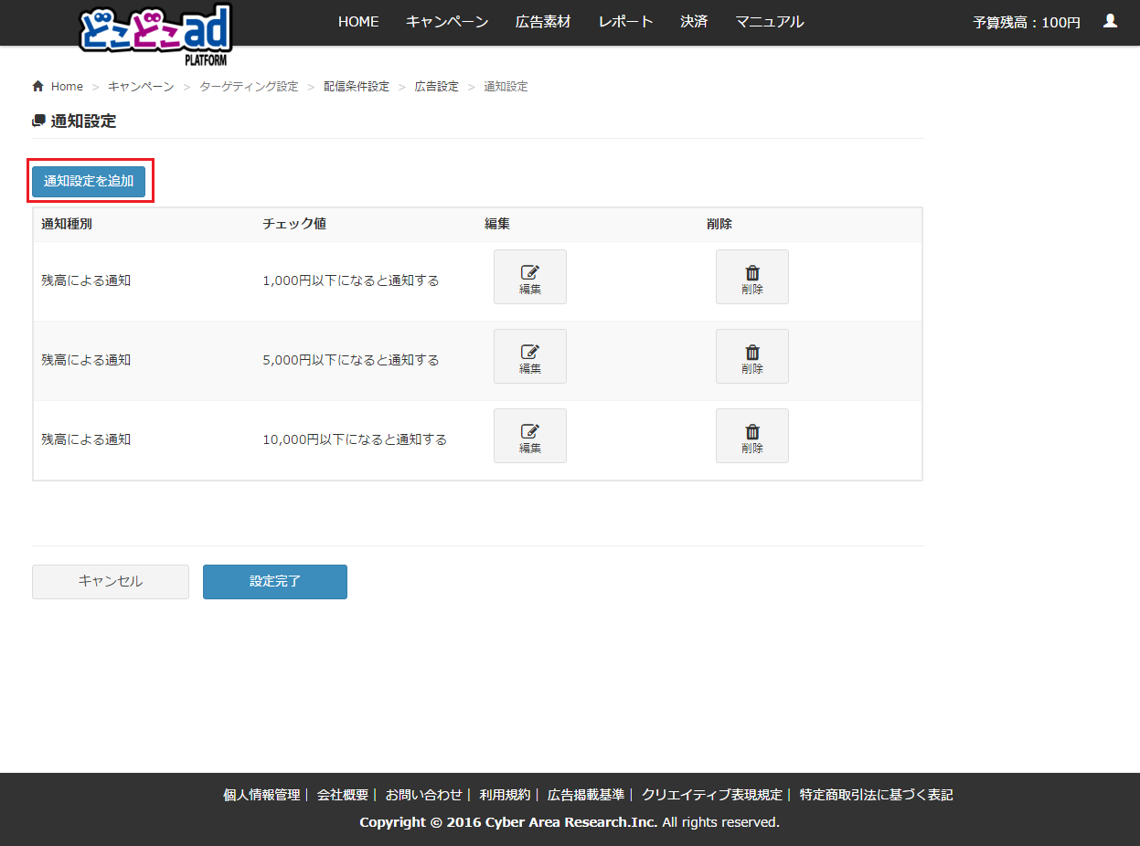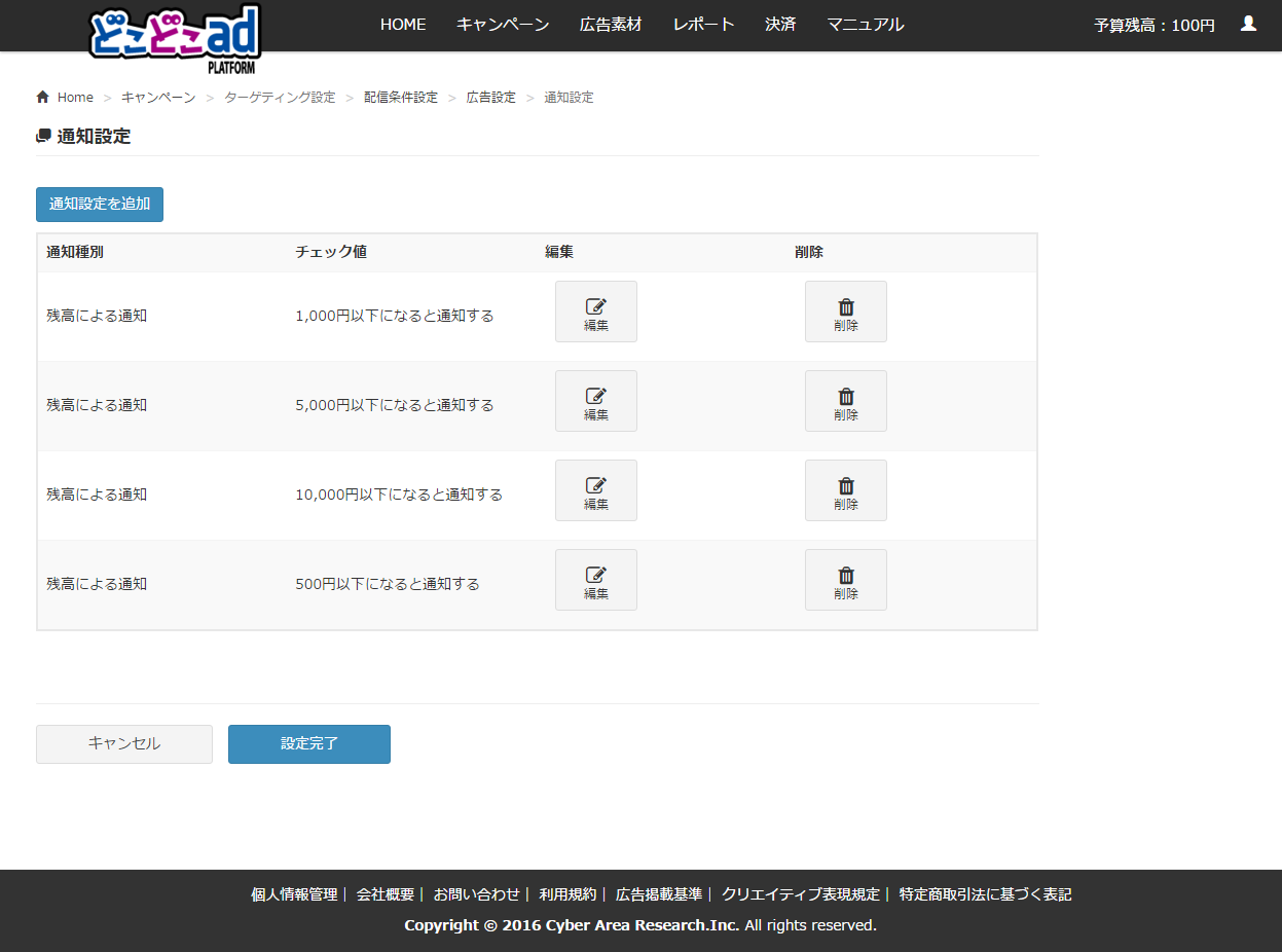 • 通知設定種別: 残予算、または終了日を基準に通知設定を行うかを選択できます。