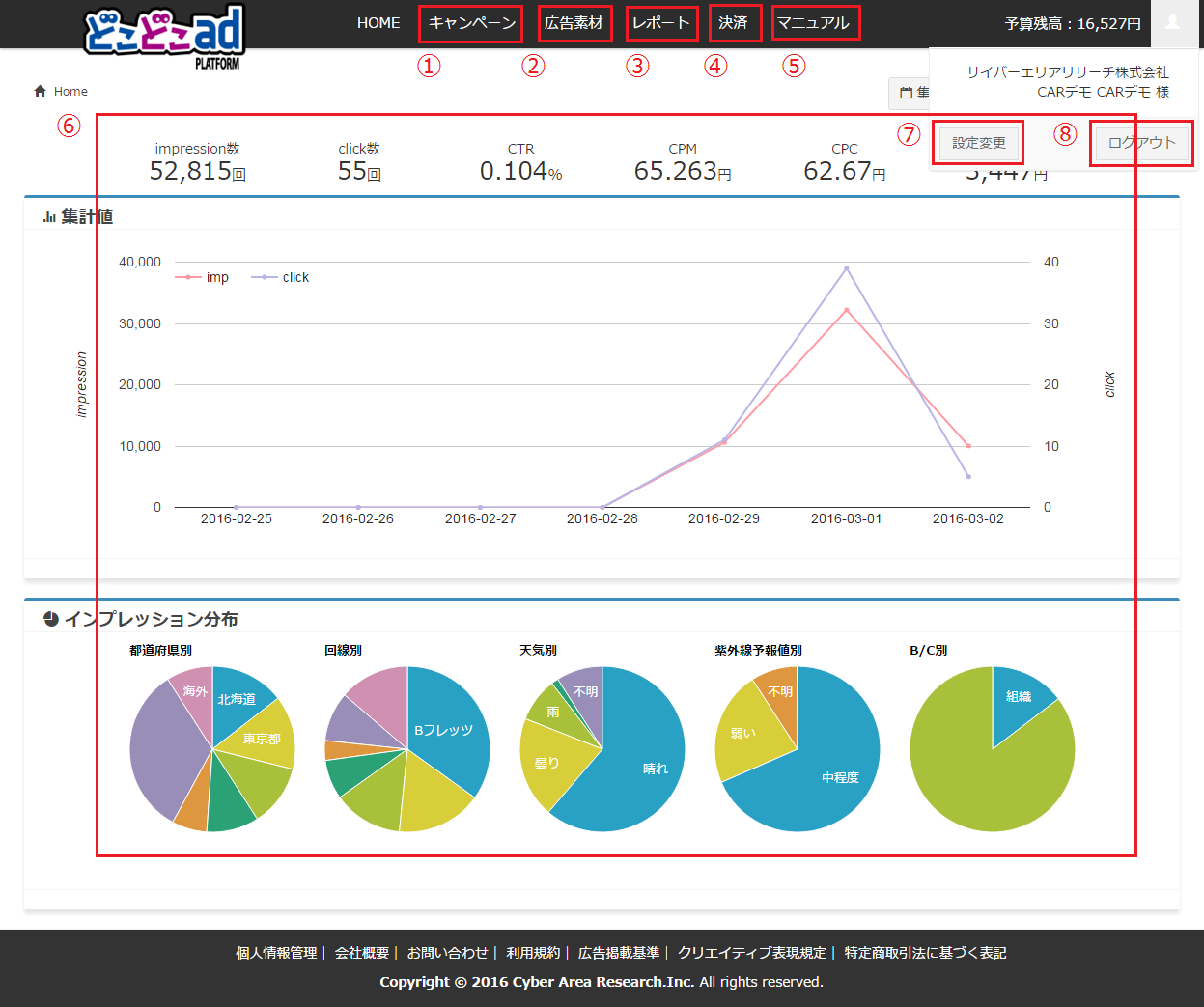 3. 時系列軸のインプレッション数、クリック数や発生したインプレッション属性の割合が閲覧できます。