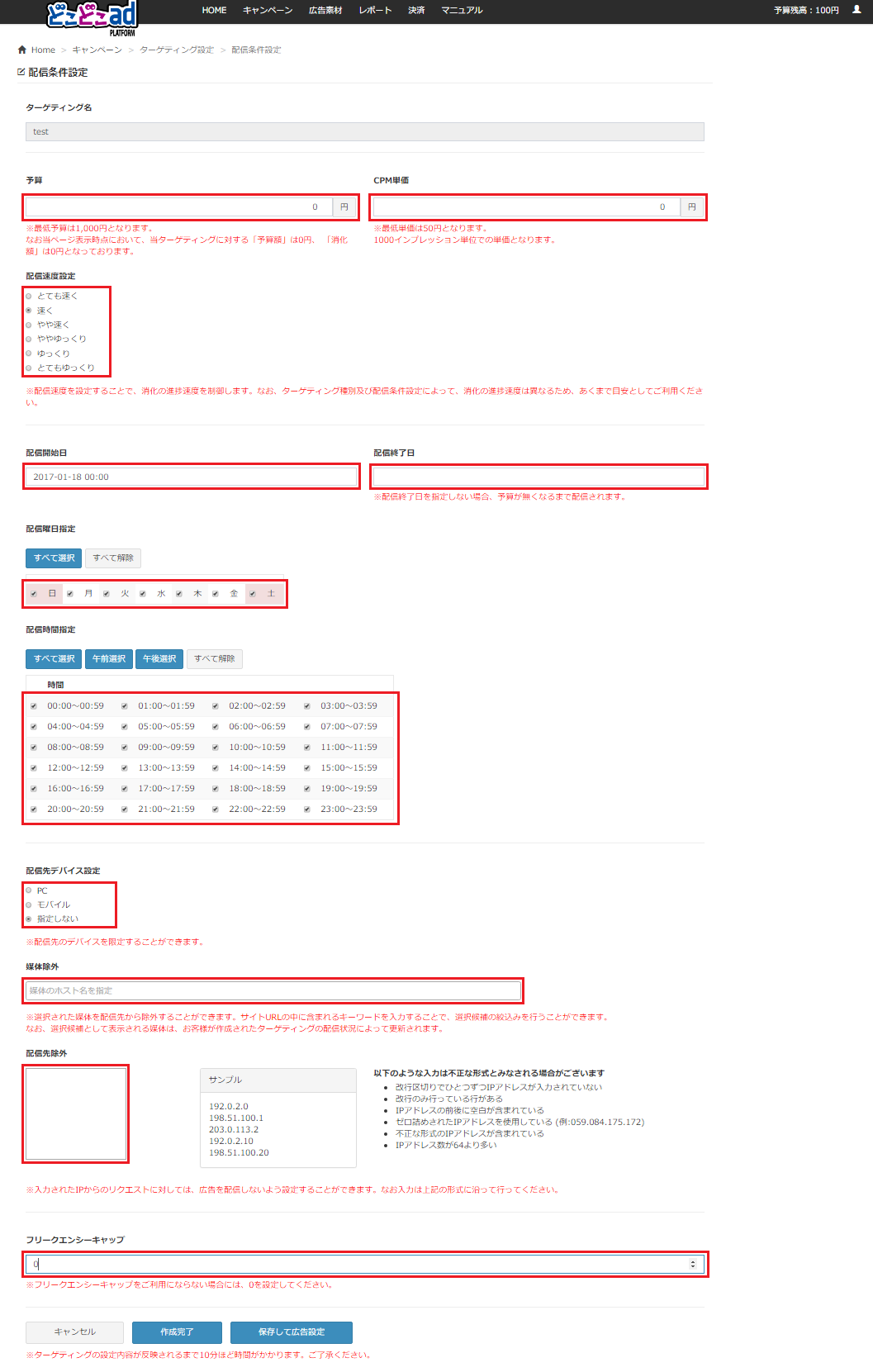 オーディエンスのIPアドレスが「配信先除外」に含まれる場合、そのオーディエンスに対して広告は配信されません。 - フリークエンシーキャップ: オーディエンスに対する広告表示回数の上限値となるフリークエンシーキャップを入力します。