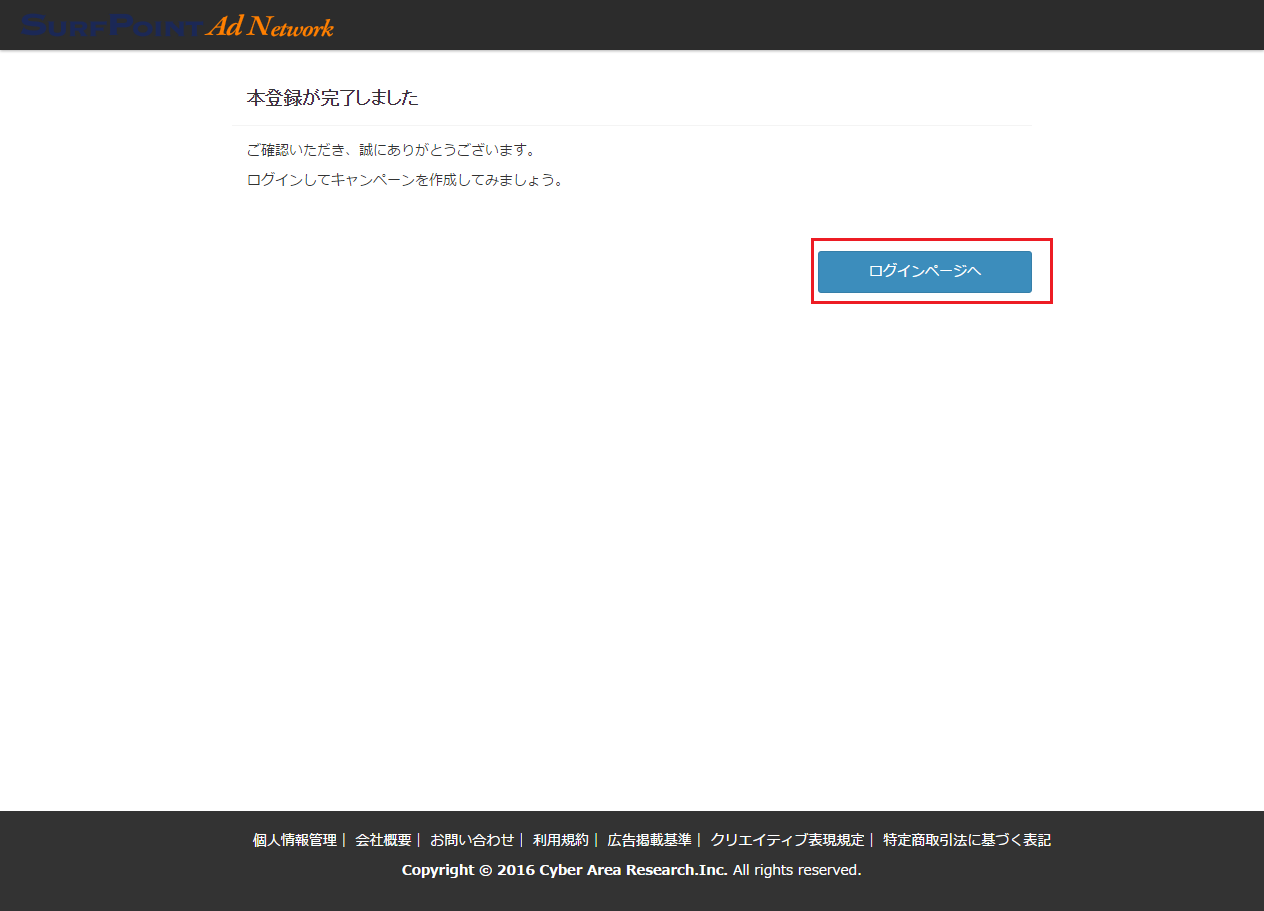 本画面が表示されたら「ログインページへ」のボタンをクリックして、ログイン画面へ移動できます。