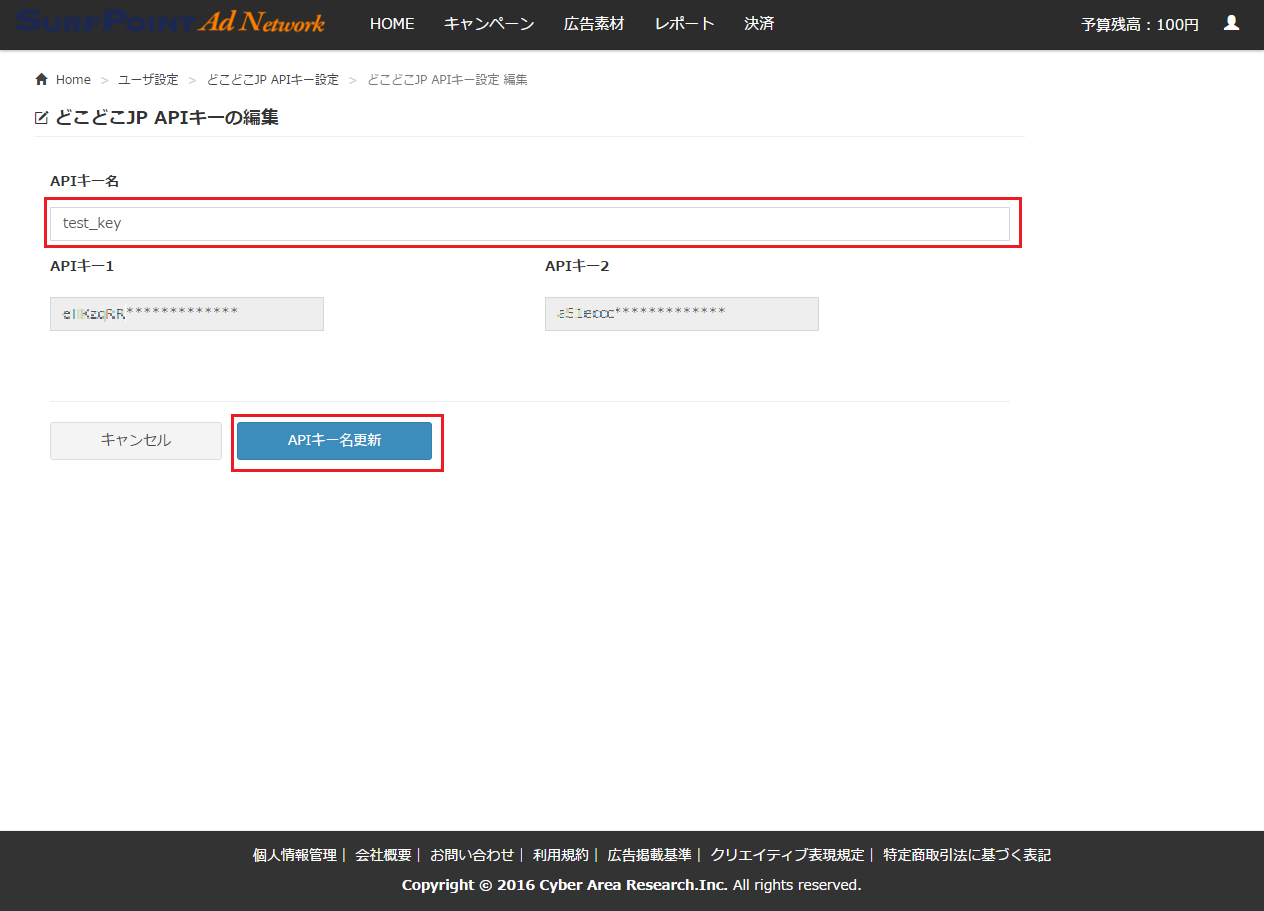 ※変更できるのは「APIキー名」のみです。APIキー1または2を変更したい場合にはAPIキーを削除し、新規に登録するようにして下さい。