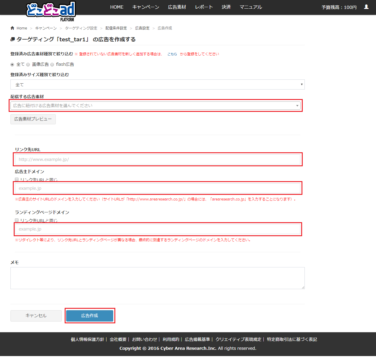 #[[広告作成画面]]に移動します。以下の項目を指定したうえで「広告作成」ボタンをクリックします。 | #[[広告作成画面]]に移動します。以下の項目を指定したうえで「広告作成」ボタンをクリックします。 | ||