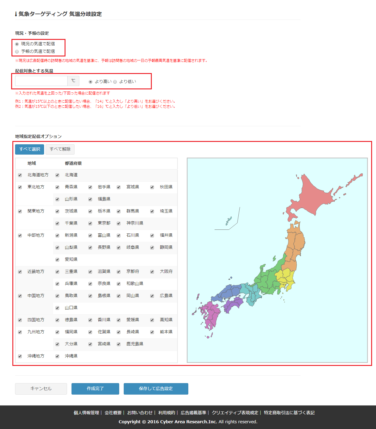 *現況・予報の設定: 広告配信対象に、現況の気温を使うか、予報最高気温を使うか選択します。<br/><br/> | *現況・予報の設定: 広告配信対象に、現況の気温を使うか、予報最高気温を使うか選択します。<br/><br/> | ||