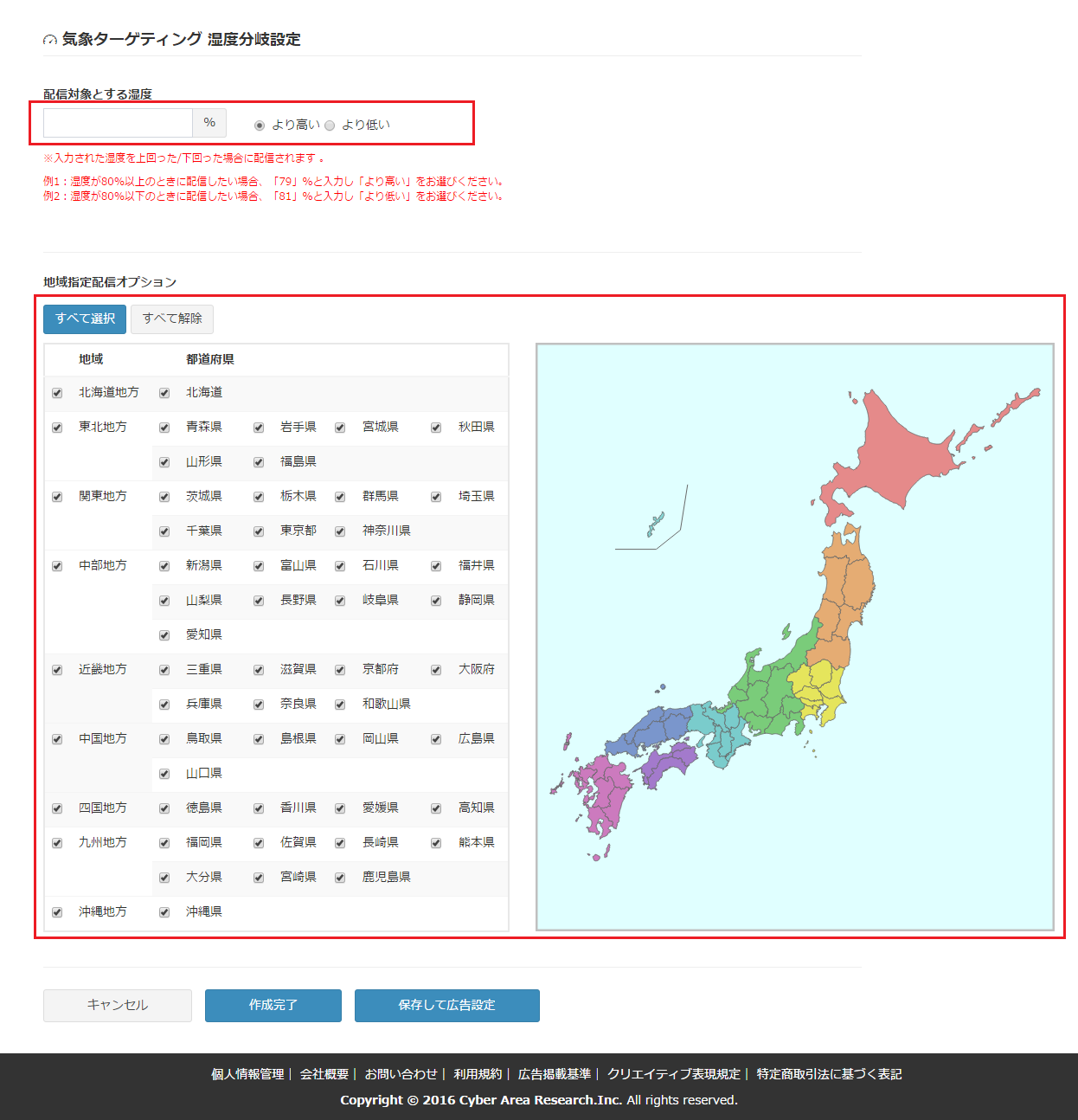 指定の湿度より高い、低い条件を選択できます。気温は0%から100%の範囲で入力してください。 - 地域指定配信オプション: 広告を配信する地域(都道府県)を選択します。