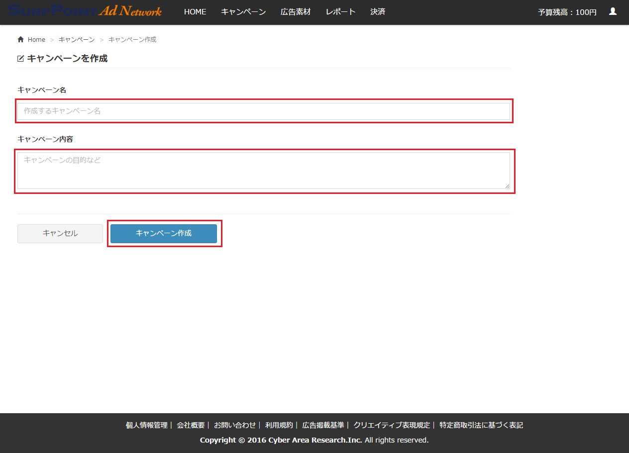 3. キャンペーン作成画面に移動します。以下の項目を指定したうえで「キャンペーン作成」ボタンをクリックします。