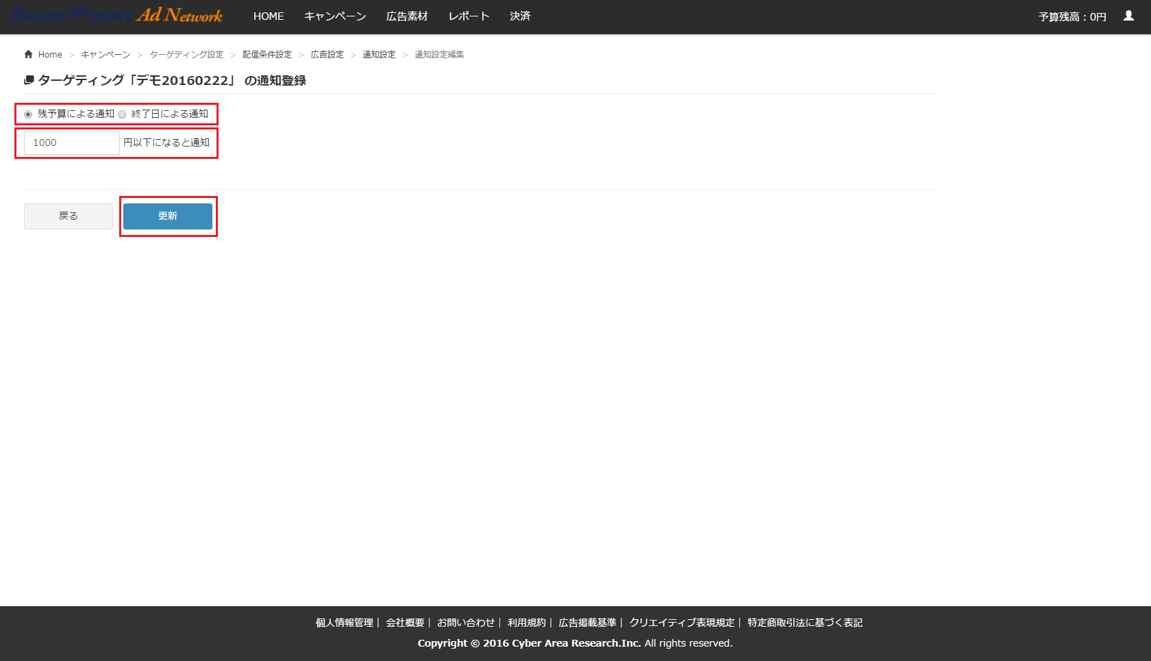 • 通知設定種別: 残予算、または終了日を基準に通知設定を行うか選択します。