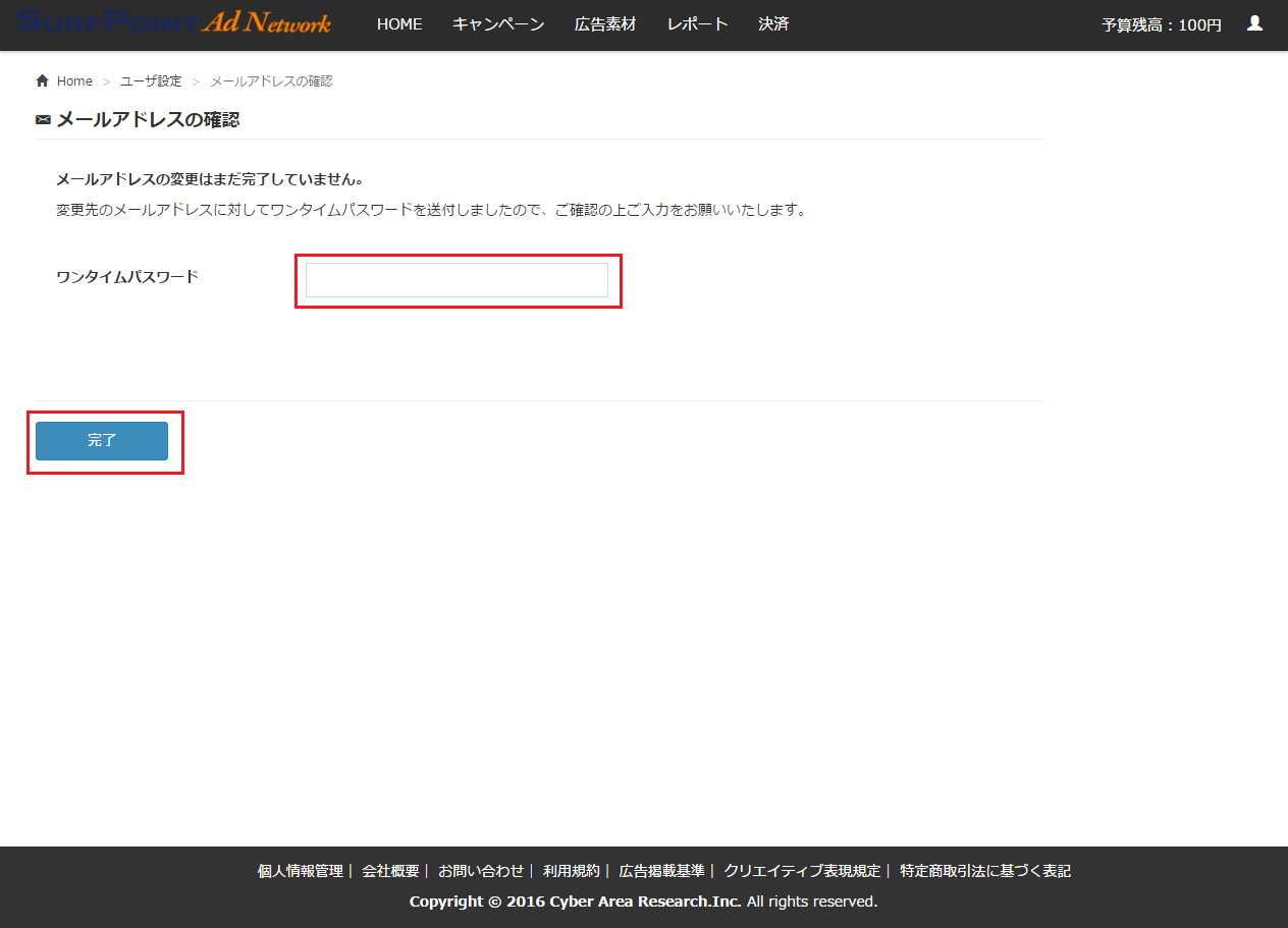 ユーザ設定画面でメールアドレスの変更を行った場合、変更後メールアドレスにワンタイムパスワードが記載された確認メールが送信されます。 確認メールに記載されたワンタイムパスワードを入力したうえで、「完了」をクリックします。