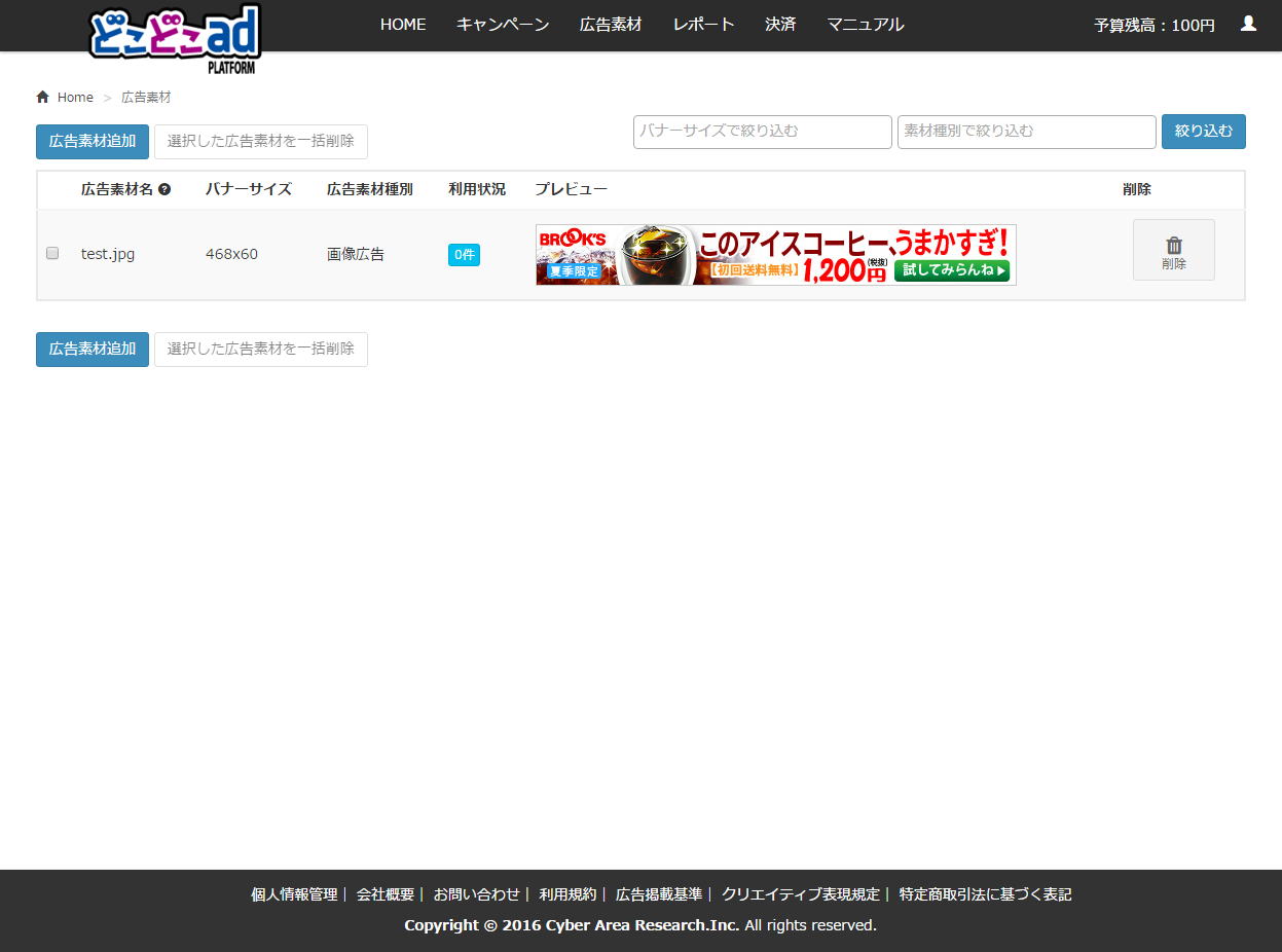 - 問題が無ければ、広告素材一覧画面に移動します。以上で広告素材の追加作業は完了です。