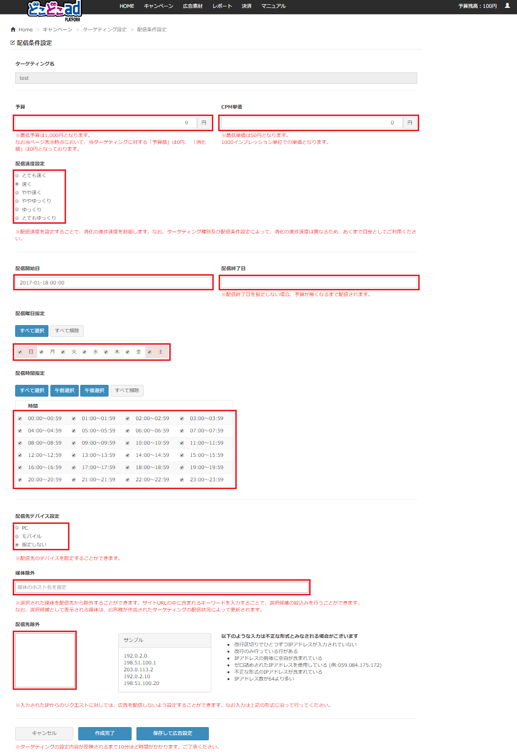 選択された媒体には広告が配信されません。 - 配信先除外: 広告を配信しないIPアドレスを入力できます。入力は任意となります。