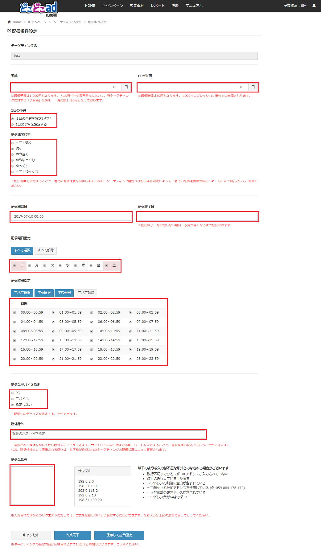 • 配信先除外: 広告を配信しないIPアドレスを入力できます。入力は任意となります。