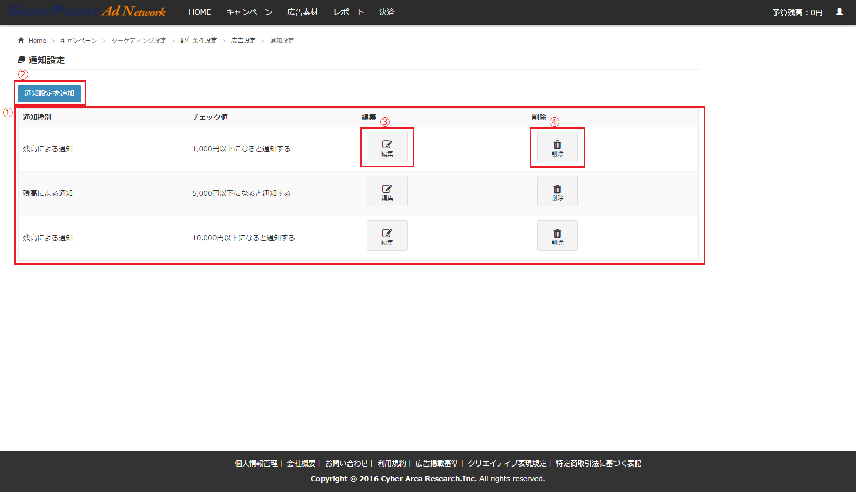 HOME画面「キャンペーン」 » キャンペーン一覧画面「ターゲティング名」 » 配信条件設定画面「保存して広告設定」 » 広告設定画面「通知設定へ」 » 通知設定画面