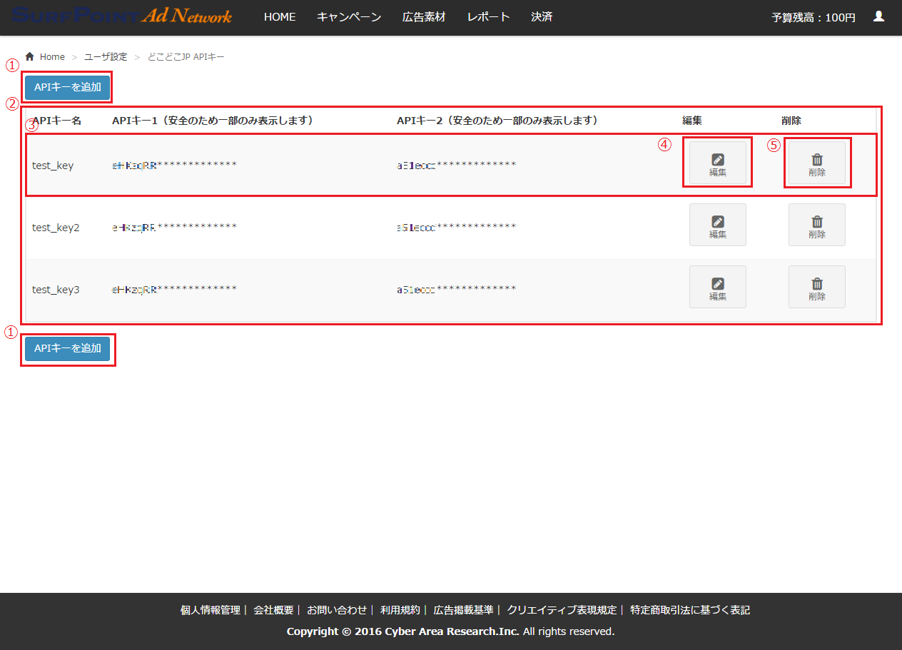 どこどこJP APIキー一覧画面には以下の機能があります。