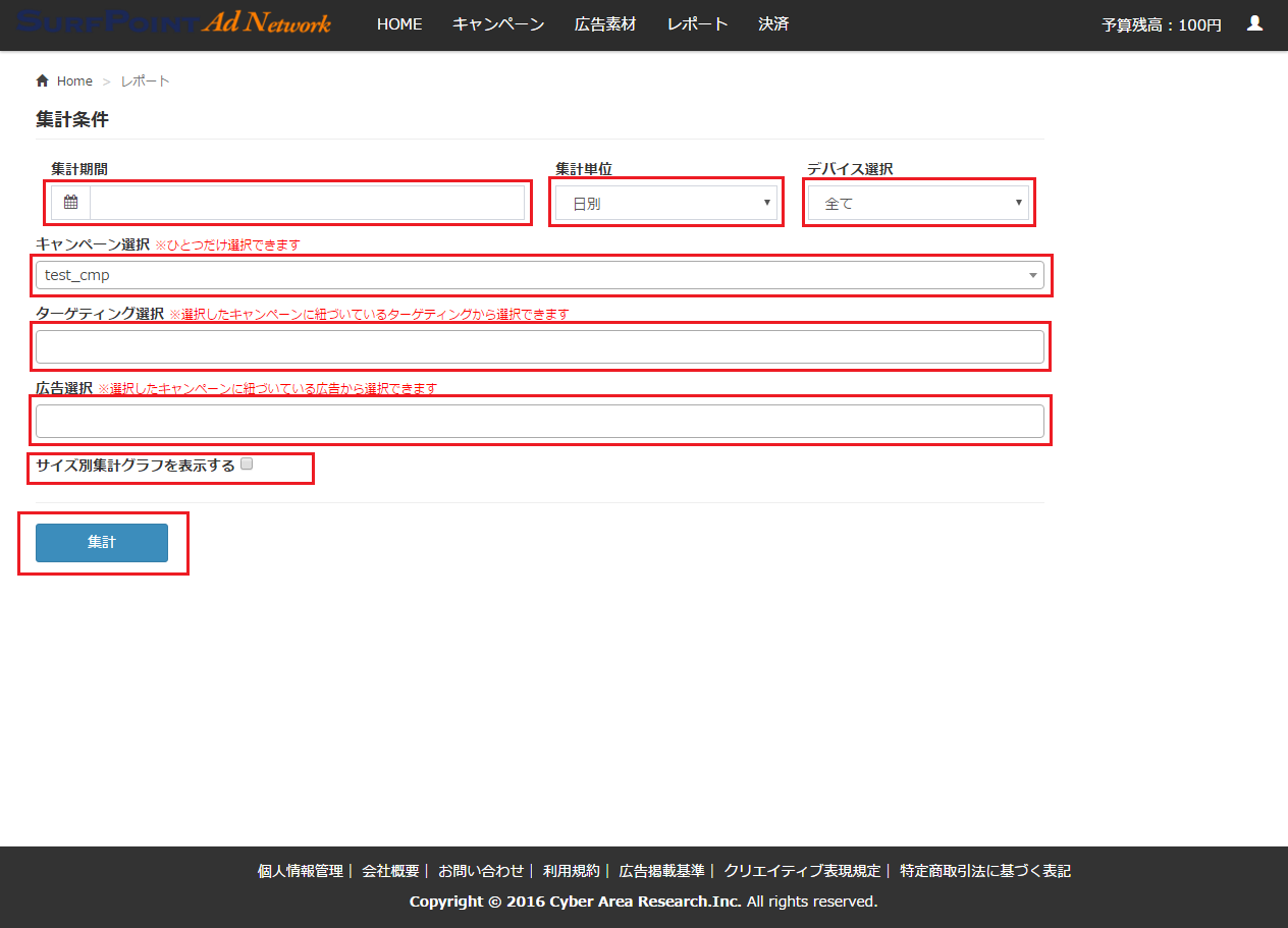 2. レポート画面(条件入力)に移動します。以下項目を指定したうえで「集計」ボタンをクリックします。