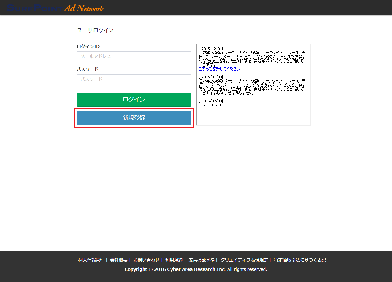 - ログイン画面に移動します。「新規登録」ボタンをクリックします。