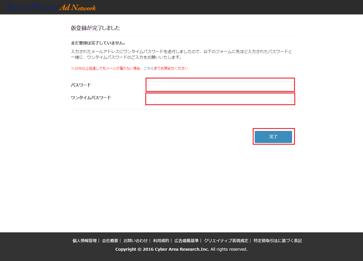 - 問題が無ければ、仮登録完了兼ワンタイムパスワード入力画面に移動します。